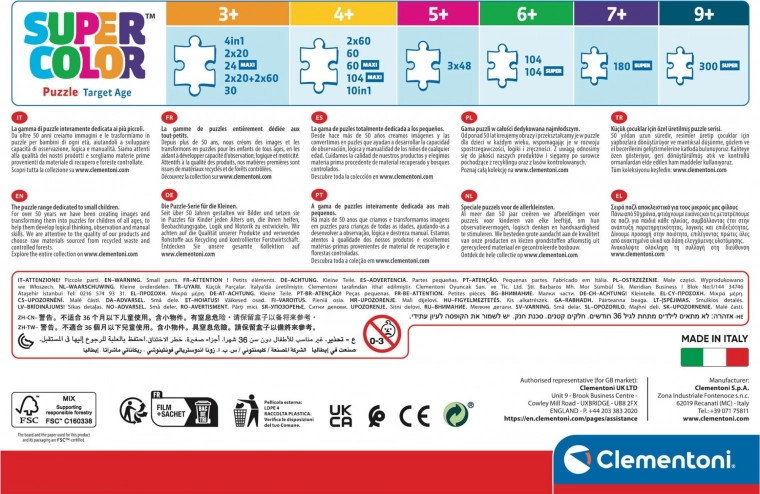Deux puzzles pour enfants avec le même nombre de pièces et le même format. Puzzle SuperColor Collection – une édition conçue spécialement pour les enfants, qui les aide à développer leur dextérité manuelle et leur sens de l’observation. La qualité des matériaux et une technique d’impression exclusive garantissent des couleurs durablement belles, vives et éclatantes.