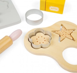 Le set offre tout ce qu’il faut pour un petit boulanger : une plaque, une balance, un bol, un rouleau, des emporte‑pièces et plus encore.