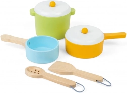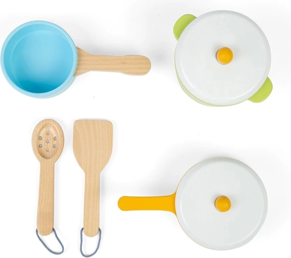 Comprend 3 casseroles, 2 couvercles et 2 ustensiles de cuisine, le tout dans des couleurs pastel qui imitent parfaitement de vrais accessoires.