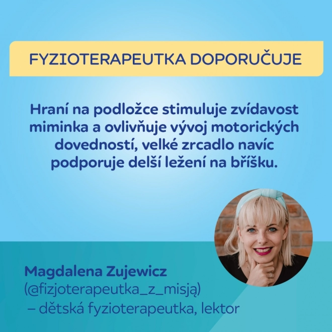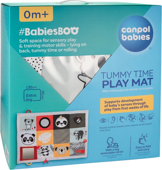 Le tapis éducatif sensoriel Canpol babies pour le temps sur le ventre de la collection BabiesBoo est une manière sûre et agréable de garder bébé en mouvement, tout en permettant au parent d’avoir un moment pour soi ou de faire des tâches domestiques. Le tapis est exceptionnellement grand et doux – 130 x 95 cm offrent à votre tout-petit confort et sécurité. Le tapis éducatif Canpol babies se plie facilement, dispose d’une poignée pratique pour un transport aisé, afin de créer un espace pour bébé où que vous en ayez besoin. Le grand miroir encourage et prolonge le temps passé sur le ventre, durant lequel bébé peut explorer différentes parties du tapis. De nombreux éléments sensoriels sollicitent les sens de l’enfant : la vue, l’ouïe et le toucher. Les différentes textures des matériaux, les couleurs et motifs contrastés ainsi que de doux sons offrent un excellent divertissement pour les sens en développement de votre bébé dès les premiers instants de sa vie. Le tapis d’éveil sensoriel Canpol babies contribue à assurer le bon développement moteur de chaque enfant. Le tapis est lavable en machine.Un espace pour bébé partout où nous en avons besoin.Recommandé par la kinésithérapeute Magdalena Zujewicz – kinésithérapeute pédiatrique, éducatrice et thérapeute en intégration sensorielle.Tapis exceptionnellement grand et moelleux offrant confort et sécurité à votre bébé.Le grand miroir suscite l’intérêt de bébé et prolonge le temps passé sur le ventre.De nombreux éléments sollicitant les sens de l’enfant : la vue, l’ouïe et le toucher.Se plie facilement grâce à une poignée confortable qui facilite le transport.Les couleurs et motifs contrastés favorisent le développement de la vision de l’enfant.Favorise le développement du toucher et exerce les compétences manuelles.Développe la coordination œil-main et la coordination audio-motrice.Facile à entretenir – lavable en machine.Idéal pour les enfants dès les premiers instants de la vie.Le jouet est fabriqué dans un matériau sûr, sans bisphénol A.Dimensions du tapis : 130 x 95 cmInstructions d’utilisation :Le mode de nettoyage est indiqué sur l’étiquette. Lavez le tapis, à l’exception du miroir, en machine à une température maximale de 30 °C, cycle délicat. Gardez le tapis de jeu propre. Lavez le tapis de jeu, à l’exception du miroir, en machine à max. 30 °C en utilisant un programme délicat. Utilisez une lessive douce adaptée aux enfants. Lavez séparément. Essuyez le miroir avec un chiffon humide. Retirez le film de protection du miroir.Avertissement ! Important pour la santé et la sécurité de votre enfant ! Vérifiez soigneusement avant chaque utilisation. Remplacez le jouet usé/endommagé par un neuf.Avertissement ! Tenir à l’écart des sources de feu. Conservez la notice pour une utilisation ultérieure.Le tapis est conforme aux exigences suivantes :Directive 2009/48/CE du Parlement européen et du Conseil relative à la sécurité des jouetsEN 71 - 1 Sécurité des jouets - Partie 1 : Propriétés mécaniques et physiquesEN 71 - 2 Sécurité des jouets - Partie 2 : InflammabilitéEN 71 - 3 Sécurité des jouets - Partie 3 : Migration de certains éléments