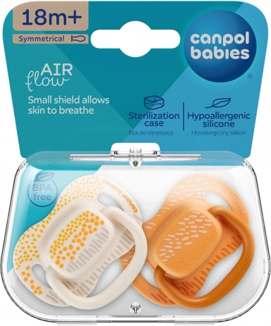 Pratique ensemble de deux tétines CANPOL BABIES avec une tétine symétrique en silicone pour les enfants à partir de 18 mois. Elles offrent un silicone hypoallergénique, sans goût ni odeur, un écusson aéré pour laisser respirer la peau et une capsule moderne pour une désinfection rapide au micro-ondes. Les tétines sont résistantes à la déformation, faciles à garder propres et ne contiennent pas de BPA.