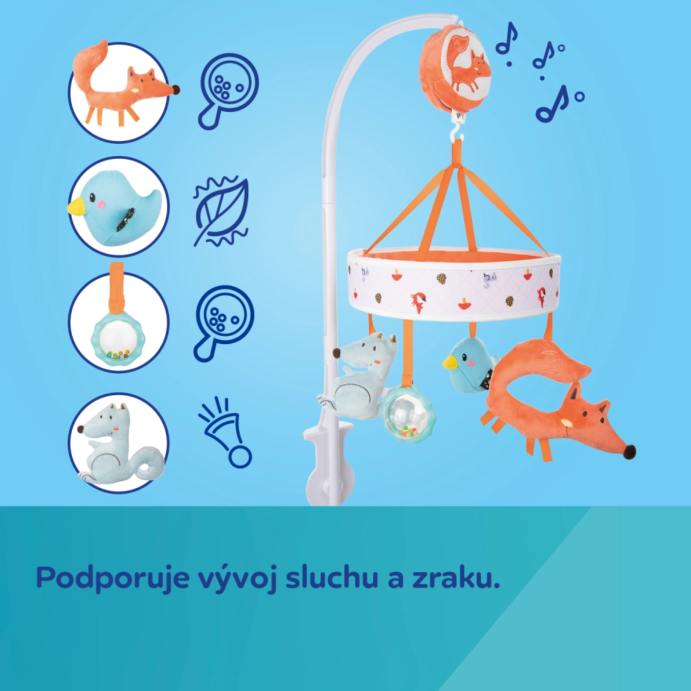 Le mobile coloré au-dessus du lit avec d’adorables peluches de la collection FOX attire l’attention de bébé et crée une agréable routine d’endormissement. Le mécanisme à remontoir joue de douces mélodies qui apaisent l’enfant et favorisent un endormissement facile – sans piles.