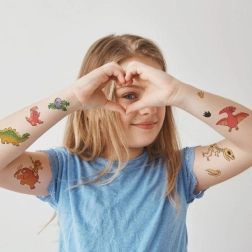 Découvrez une collection de tatouages temporaires avec des dinosaures populaires. Les enfants peuvent choisir leur motif préféré et se transformer en experts dinos en un instant. Les tatouages s’appliquent et se retirent facilement et sont parfaits pour les fêtes d’enfants, les camps ou comme petite attention.