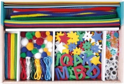 - Papiers colorés, éléments en mousse, fils chenille, yeux mobiles, pompons, bâtonnets en bois pour glace, boutons et autres petits accessoires