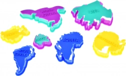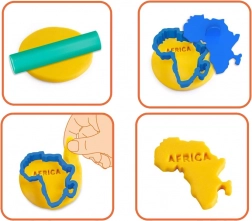 Le kit contient tout le nécessaire : pâte à modeler en cinq couleurs, 7 emporte-pièces en forme de continents, 7 tampons avec les noms des continents et un rouleau. Il suffit d’étaler la pâte en une fine couche et de former le continent choisi à l’aide des emporte-pièces.