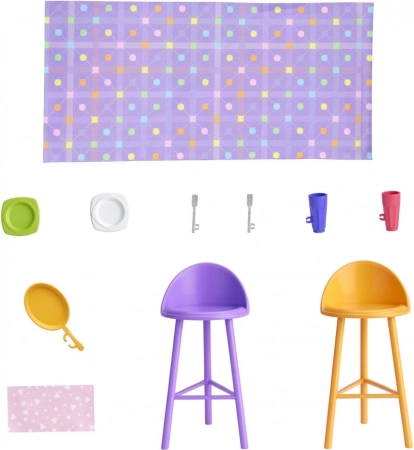 - Maison Barbie, poupée Barbie, 11 accessoires (p. ex. vaisselle, 2 chaises, petite serviette, couverture, etc.)