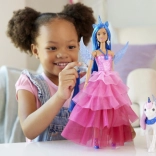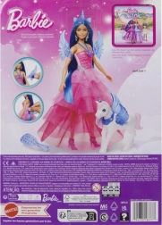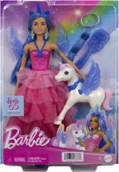 Célébrez le 65e anniversaire de BARBIE avec un coffret magique princesse et son alicorne ! La poupée, aux longs cheveux bleus, robe rose et ailes et queue amovibles, invite à un monde de fantaisie. Sont inclus un diadème avec corne, des boucles d’oreilles argentées, des chaussures stylées et une brosse pour coiffer. Un licorne ailée accompagne les histoires pleines de magie.