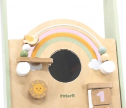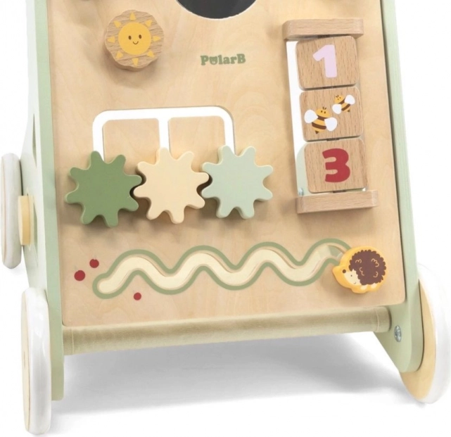 Le chariot de marche à pousser PolarB Viga est conçu pour accompagner en toute sécurité les enfants dans leurs premiers pas tout en les motivant à explorer. Le panneau avant propose une multitude d’activités – des roues dentées tournantes aux labyrinthes coulissants, en passant par le tri des formes et le miroir, qui stimulent naturellement les sens et la pensée logique.
