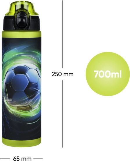 Impression football stylée et repère latéral pour suivre votre hydratation. Idéale pour l’école, l’entraînement et les déplacements.