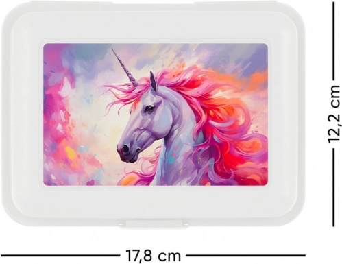 La boîte en plastique est ornée d'un motif coloré de licorne avec des nuances vives de rose et de violet, qui attire l'attention et plait surtout aux enfants.