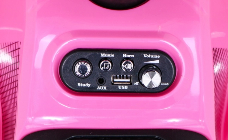 La musique et les sons ajoutent encore plus de fun – le panneau audio intégré permet la lecture via USB, AUX et des mélodies préinstallées. La selle ergonomique et la garde au sol adaptée favorisent une conduite confortable et stable.