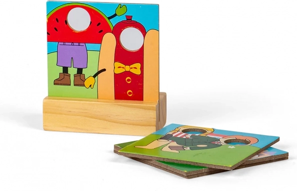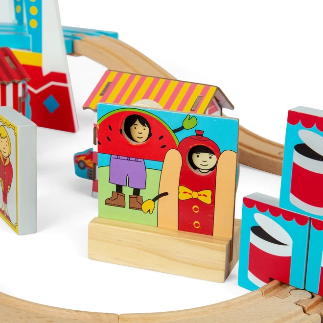 Ce circuit de train en bois sur le thème de la fête foraine contient tout le nécessaire pour se plonger dans des mondes pleins de fun et de joie. Les enfants peuvent faire passer le train près du chapiteau de cirque, pêcher des canards ou se prendre en photo avec des décors humoristiques. Le set comprend :