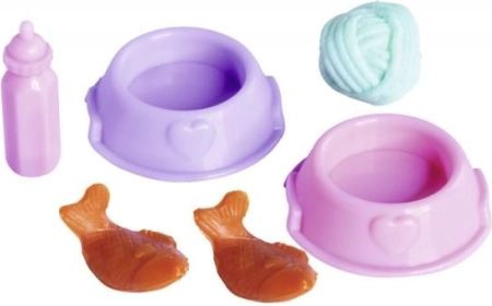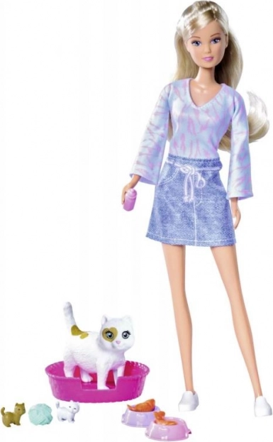 La poupée Steffi est livrée avec un kit de soin pour animaux, y compris un lit pour chat et des bols de nourriture.
