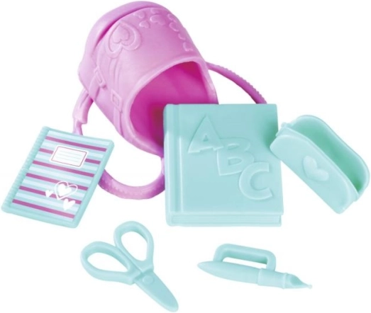 Comprend des fournitures scolaires comme un cahier, des ciseaux, une trousse, un stylo et un manuel pour un jeu réaliste.