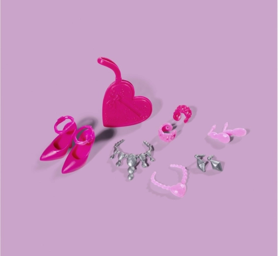La boîte contient 2 colliers, 2 paires de boucles d’oreilles, 2 bracelets, un sac à main en forme de cœur et des chaussures à talons pour des possibilités de style infinies.