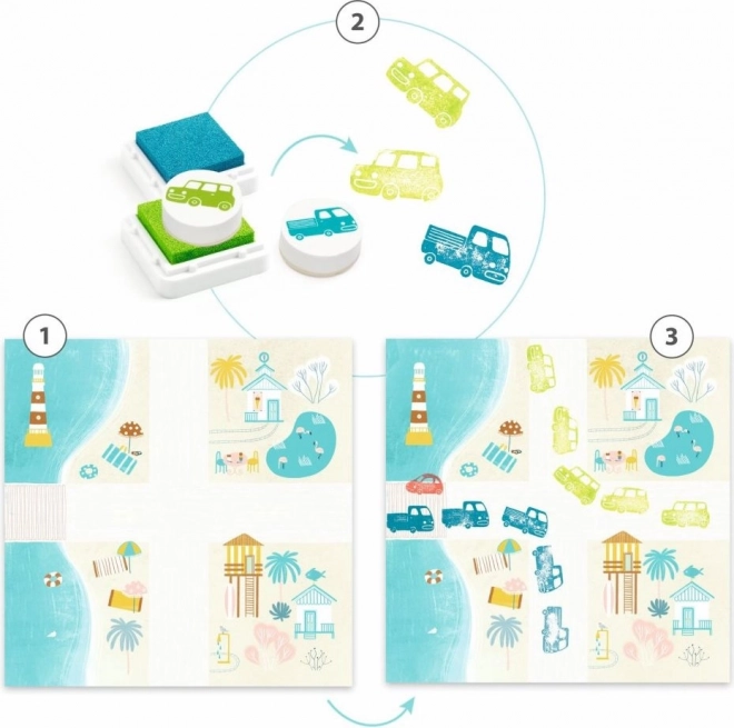 Un ensemble de tampons avec des motifs de petites voitures qui permet aux enfants de créer de charmantes images et de développer leur créativité.
