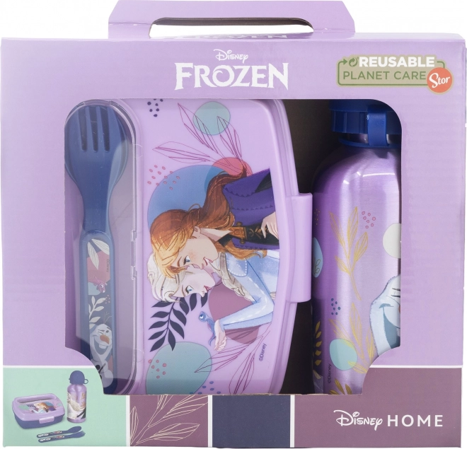 Set repas 4 pièces pour enfants avec motif LA REINE DES NEIGES de STOR : comprend une gourde en aluminium 400 ml, une boîte à goûter et un set de couverts (cuillère et fourchette). Idéal pour l’école et les sorties, sans BPA.