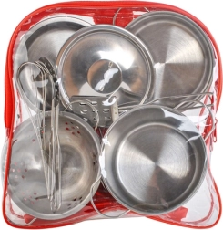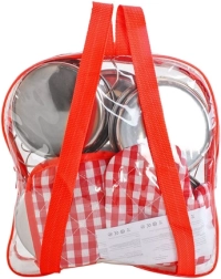 - 13 pièces – 2 casseroles (petite/grande), poêle, passoire, couvercle, 6 ustensiles, dessous de plat en textile et gant, sac à dos transparent.