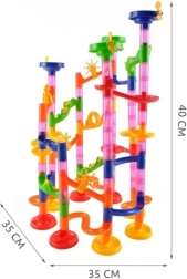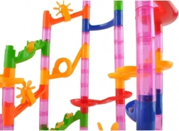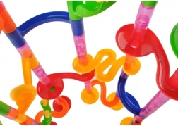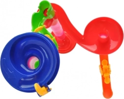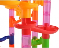 Cette piste de billes colorée permet aux enfants de construire des parcours variés de difficulté différente. Elle comprend des roues à vent, boucles et barrières que les billes actionnent en cours de route. Les pièces se connectent facilement et intuitivement, ce qui permet de changer rapidement les configurations et d’essayer de nouvelles idées.