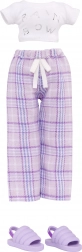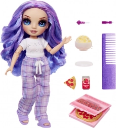 Violet porte un pyjama violet à carreaux confortable, des pantoufles douces et un set d’en-cas – pizza, popcorn, assiette et boisson. Idéal pour des mises en scène thématiques et des soirées pyjama.
