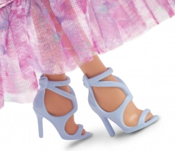La poupée porte une magnifique robe longue à fleurs avec un ourlet volanté et un ruban bleu clair, ajoutant élégance et grâce.