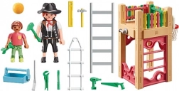 Le set comprend une figurine de femme charpentière et un jeune sportif, qui entraînent les enfants dans un jeu dynamique.