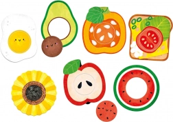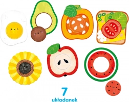 Jouer avec le puzzle développe naturellement la motricité fine, le sens de l’observation et la patience. Ensemble, vous pouvez nommer les aliments, les couleurs et les formes, chercher similitudes et différences, et inventer des questions comme « Qu’est-ce qui a des noyaux ? » ou « Où est l’œuf ? ». Les plus grands utiliseront aussi les pièces pour jouer au magasin ou à la cuisine, ou comme inspiration pour leurs propres dessins.