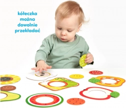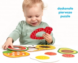 Un premier puzzle pour les tout-petits, qui sent bon l’amusement ! Le set contient 7 grands puzzles de deux pièces sur le thème de la nourriture avec des pastilles interchangeables. Grâce au système d’emboîtement simple, l’assemblage est intuitif et motivant. Développe la motricité fine, la concentration soutenue, la perception des formes et des couleurs et la joie naturelle de découvrir.