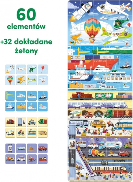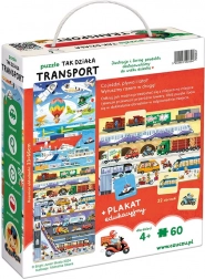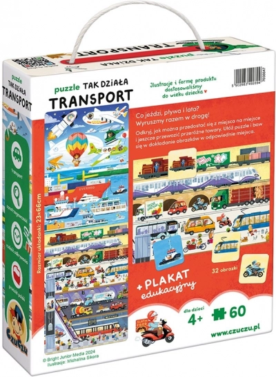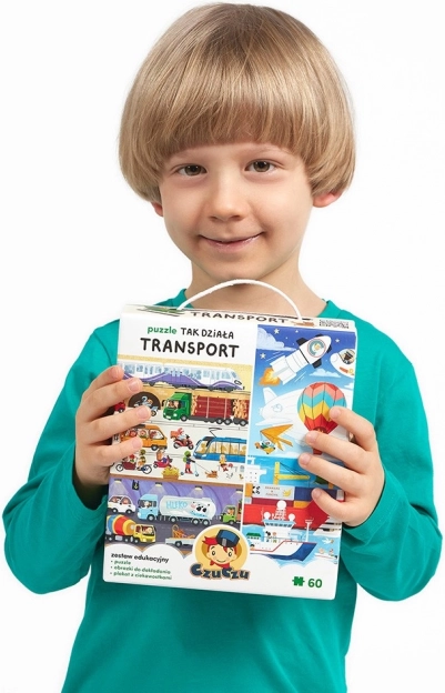 Le puzzle Voici comment fonctionne le transport est un coffret éducatif unique pour les enfants d’âge préscolaire, surtout s’ils aiment les véhicules. Il comprend un puzzle de 60 pièces, 32 images correspondantes et une affiche éducative. Amusons-nous ! Fais attention à ce qui circule sur les routes, flotte sur l’eau et vole dans les airs. Des moyens de transport connus et appréciés comme d’autres, plus discrets, seront une excellente motivation pour jouer. En assemblant le puzzle, les enfants développent de manière ludique leur sens de l’observation, leur patience et acquièrent de nouvelles connaissances. Amusez-vous bien !
