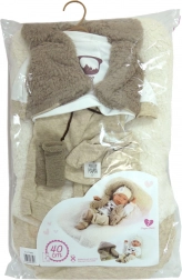 Ensemble de vêtements pour poupée NEW BORN de 40–42 cm, élégant et de qualité, offrant tout le nécessaire pour l’habiller et jouer confortablement. Il comprend 5 pièces, dont un petit coussin/tapis réversible, est fabriqué à la main en Espagne et livré dans un emballage pratique avec un cintre en plastique. Idéal à partir de 3 ans.
