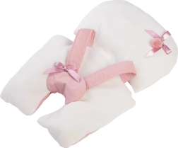 Un coussin moelleux avec nœud décoratif et sangles sécurisées sert de petite chaise pratique pour asseoir la poupée de façon stable.