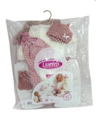 Ensemble stylé pour poupées NEW BORN de 40–42 cm comprenant une tenue 3 pièces avec mouchoir décoratif et un coussin doux avec nœud et sangles, pouvant servir de petite chaise pratique pour la poupée. Fabrication artisanale en Espagne garantissant une qualité et une finition soignée – un accessoire idéal pour les petits parents dès 3 ans.