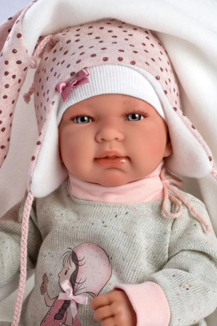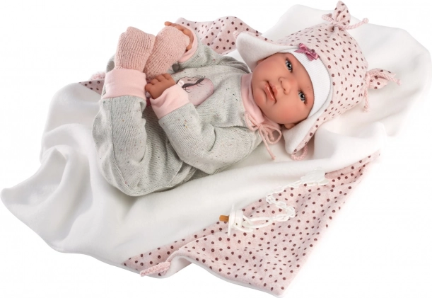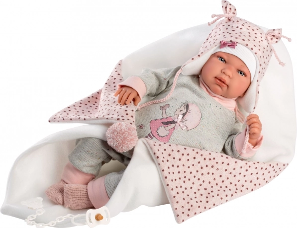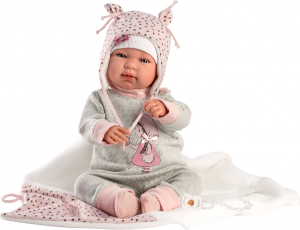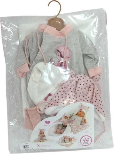 Élégante tenue 4 pièces pour poupées NEW BORN de 43–44 cm, avec un harmonieux duo rose‑gris, une couverture douce avec pompon à nouer et un savoir‑faire artisanal espagnol de qualité. Emballage pratique sur cintre en plastique dans une housse transparente et conception sûre dès 3 ans.