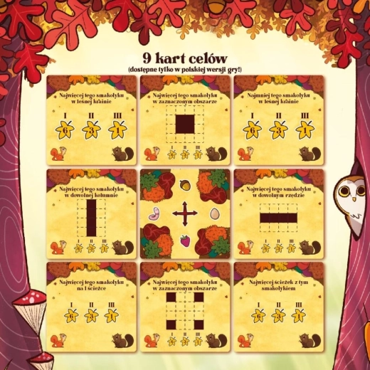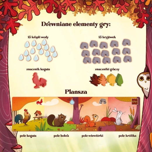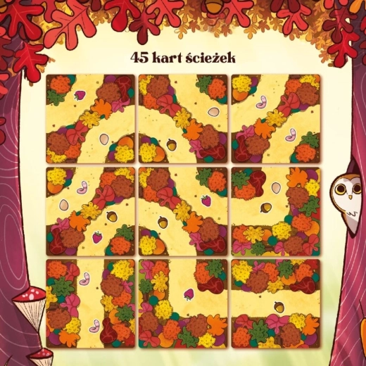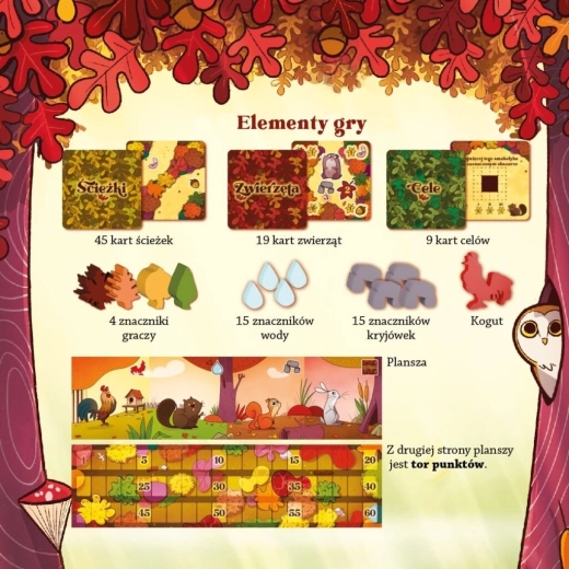 Créez un paysage forestier rempli de sentiers sinueux. Organisez-les de manière à faciliter l’accès des animaux aux friandises. Pendant la partie, agrandissez les abris des animaux (ils pourront contenir plus de provisions !) et approvisionnez-les en eau (vous gagnerez des points supplémentaires !). Pour gagner, vous devez accumuler plus de provisions que vos adversaires.
