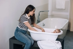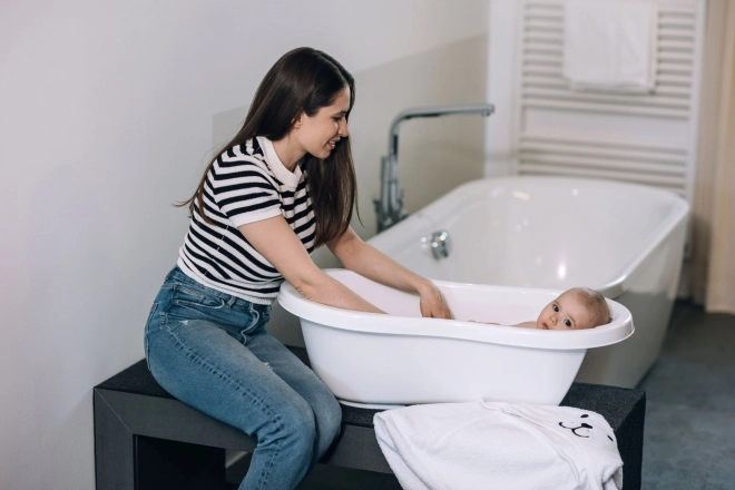 La baignoire propose deux positions de bain pour différentes étapes d’âge – allongée pour nouveau-nés 0–12 mois et assise pour enfants 12–36 mois. Grâce à son faible poids et à ses surfaces lisses, elle se transporte et se nettoie facilement. Le produit est conforme à la norme européenne EN 17072 pour une sécurité maximale.