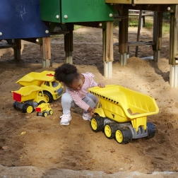 Ses six grandes roues garantissent une excellente stabilité sur terrain comme en intérieur. Les pneus qui ne laissent pas de traces sont doux pour les sols et la poignée permet un basculement fluide et sécurisé de la charge. Jouer avec ce camion-benne développe la motricité globale, les capacités de coordination et favorise l’autonomie ainsi que la curiosité.