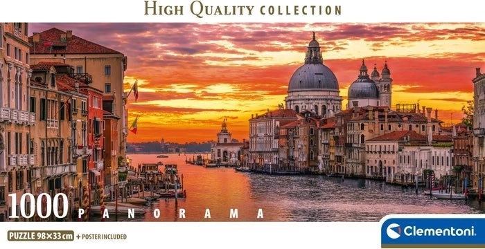 Puzzle panoramique 1000 pièces avec motif du Grand Canal à Venise. Impression de qualité, carton épais, emballage compact écoresponsable. Dimensions 98 × 33 cm.