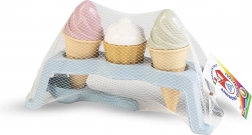 • 8 pièces : 2 cornets de glace, un moule à petit gâteau avec son gâteau, une cuillère à glace et un présentoir.