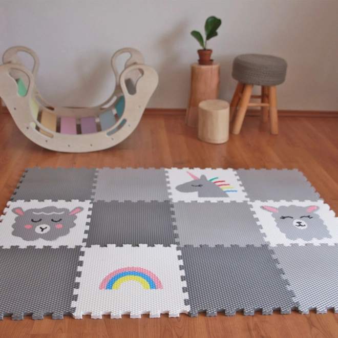 - 12 tapis puzzle en mousse (4 gris, 4 gris clair, 1 blanc avec lama, 1 blanc avec agneau, 1 blanc avec arc-en-ciel, 1 blanc avec licorne gris clair)