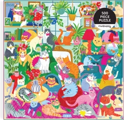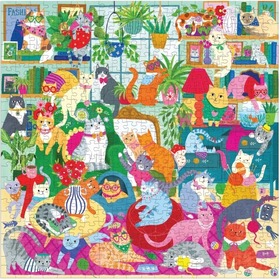 Le puzzle offre une illustration colorée remplie de chats de différentes couleurs et motifs dans un cadre domestique accueillant.