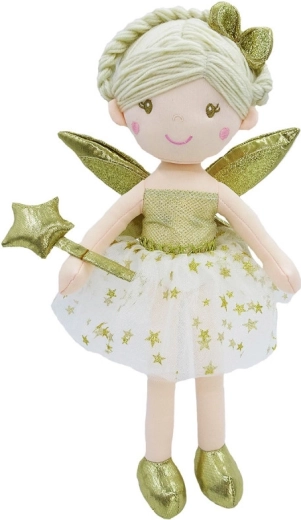 Cette adorable poupée fée en tissu est fabriquée dans un matériau doux et agréable et fait un excellent doudou et compagnon de jeu. Elle a de cheveux laineux beiges en queue-de-cheval, de yeux brodés marron et un sourire charmant. Elle porte une robe dorée pailletée avec une jupe en tulle blanche, des ailes dorées dans le dos et tient une baguette scintillante avec étoile. Une fabrication soignée et des matériaux de qualité garantissent une longue durée de vie. Sans effets sonores.