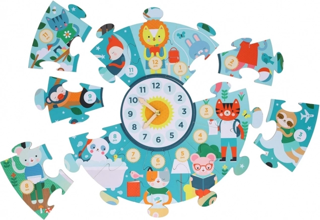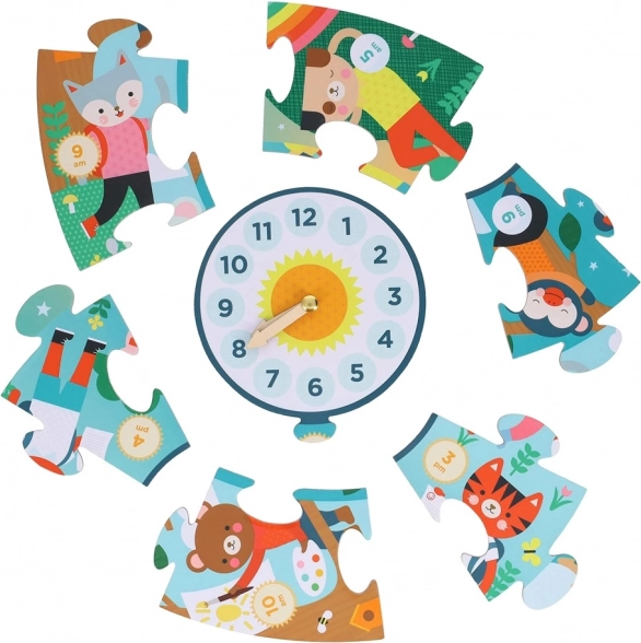 Au centre du puzzle se trouve un grand cadran avec des aiguilles réglables. Les enfants s’entraînent ainsi de manière ludique à indiquer les heures et les minutes et relient le jeu à un apprentissage concret.