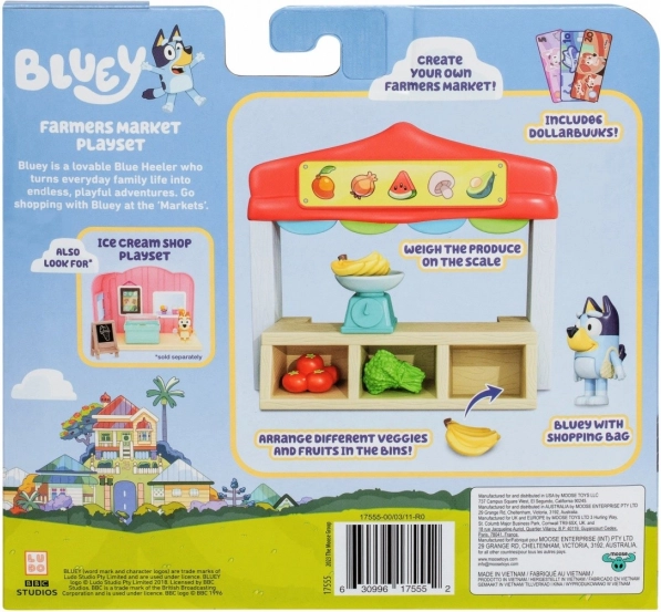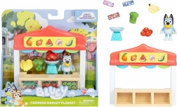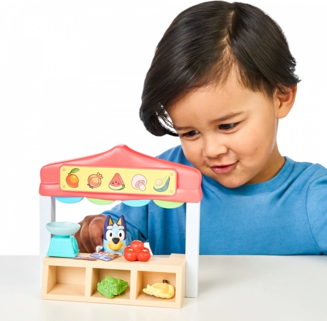 - Stand avec balance, compartiments amovibles, fruits et légumes en plastique, billets, figurine BLUEY