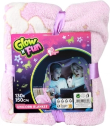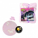 Couverture en peluche toute douce avec motifs de licornes et d’étoiles qui brillent réellement dans l’obscurité après exposition à la lumière. Il suffit de l’exposer un moment et vous profiterez à la fois d’un magique scintillement nocturne, d’une chaleur agréable et d’un toucher soyeux.