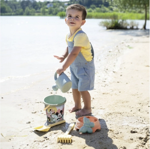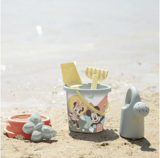Le set comprend un seau avec l’image de Mickey Mouse, un râteau, une pelle, un moule et un arrosoir. Du plastique recyclé a été utilisé pour la fabrication. Fabriqué en France.