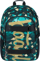 Sac à dos avec trois compartiments fermés séparément, incluant une poche pour ordinateur portable et des sangles pour skateboard. Léger et en matériau imperméable.