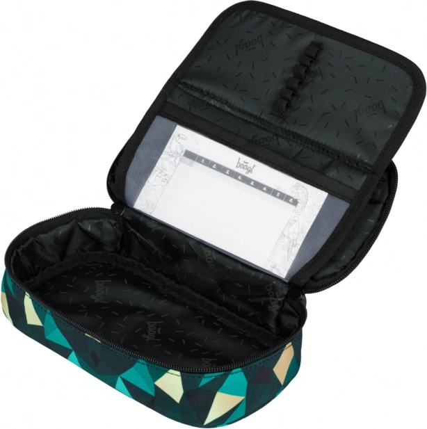 Trousse avec une séparation intérieure rabattable, une poche zippée et un support pour l'emploi du temps. Design élégant et pratique.
