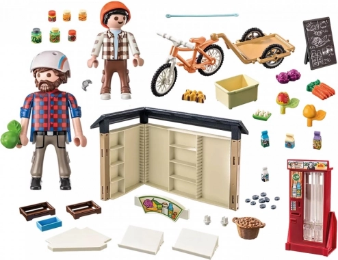 Le set favorise le jeu de rôle créatif – de la récolte des cultures au réassort des marchandises, jusqu’au paiement et au chargement des courses. Le distributeur de bouteilles assure une vente de boissons pratique et les achats peuvent être facilement transportés dans la remorque accrochée au vélo.