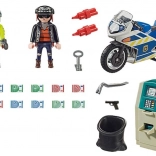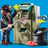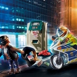 Le set d’action PLAYMOBIL de la gamme City Action propose une course-poursuite palpitante en ville : un policier à moto poursuit un pickpocket qui a braqué un distributeur automatique. La boîte contient 2 figurines, une moto, un distributeur automatique, un pied-de-biche, un sac pour le butin et des billets – tout pour des aventures urbaines réalistes.