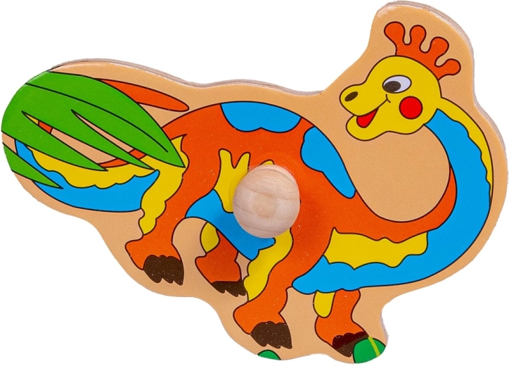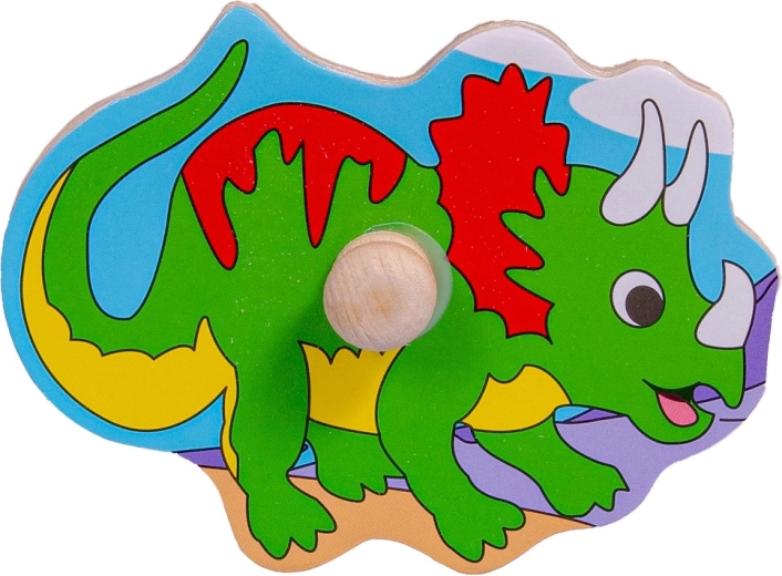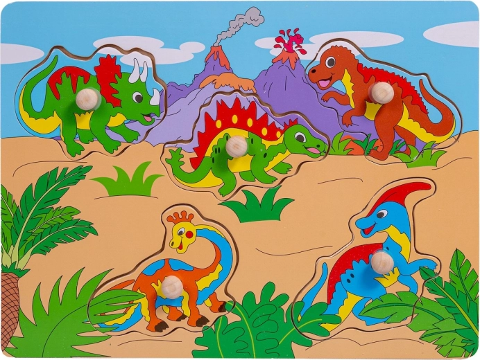 Puzzle en bois à motif de dinosaures pour développer la motricité fine et les compétences cognitives des enfants. Contient des pièces en bois colorées avec des poignées pour une manipulation facile.